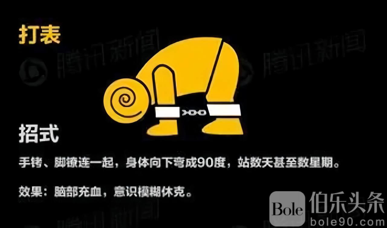 手铐、脚镣连一起,身体向下弯成90度,站数天甚至数星期。被讯者易脑部充血,意识模糊休克。