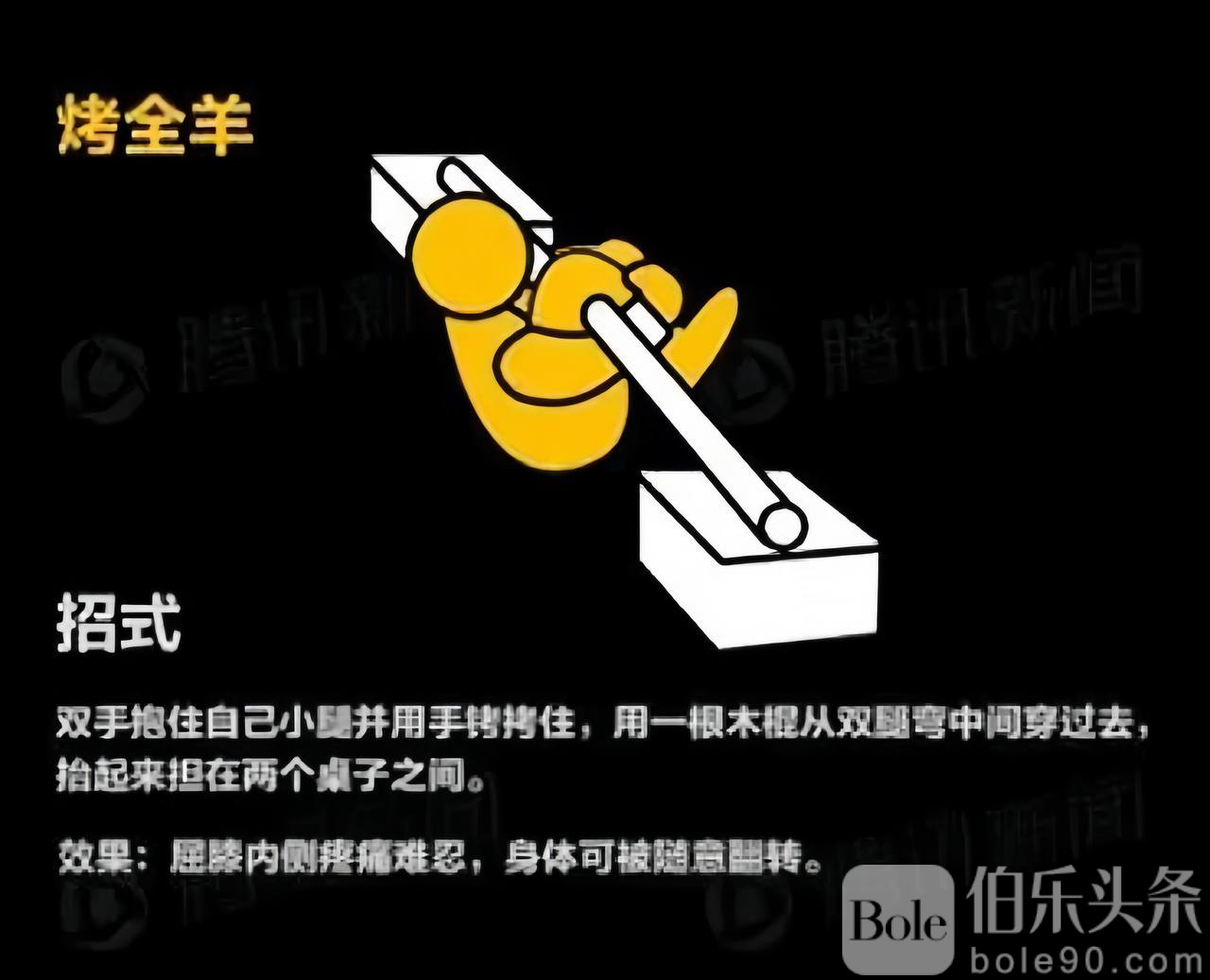 双手抱住自己小腿并用手铐拷住,用一根木棍从双腿弯中间穿过去,抬起来担在两个桌子之间。被讯者屈膝内侧疼痛难忍,身体可被随意翻转。