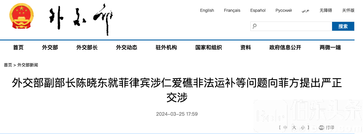陈晓东指出,3月23日,菲律宾一艘民用船和两艘海警船未经中国政府允许,擅自冲闯中国南沙群岛仁爱礁附近海域,企图向在该礁非法“坐滩”的军舰运送包括建筑材料在内的物资,建立永久军事哨所,实现长期非法占领。这严重违反《南海各方行为宣言》,严重违背菲方自身承诺,严重侵犯中方领土主权和海洋权益,破坏地区和平稳定,中方对此坚决反对。中国对包括仁爱礁在内的南沙群岛及其附近海域拥有无可争辩的主权。菲方在仁爱礁问题上一再出尔反尔,挑起事端,这是导致现地局势一再升温的根本原因。中方再次敦促菲方信守承诺、遵守共识,停止在海上侵权挑衅,停止任何可能导致局势复杂化的单边行动,切实回到同中方对话协商妥处分歧的正确轨道。中方将继续按照国内法和国际法,采取必要措施,坚定维护国家领土主权和海洋权益。