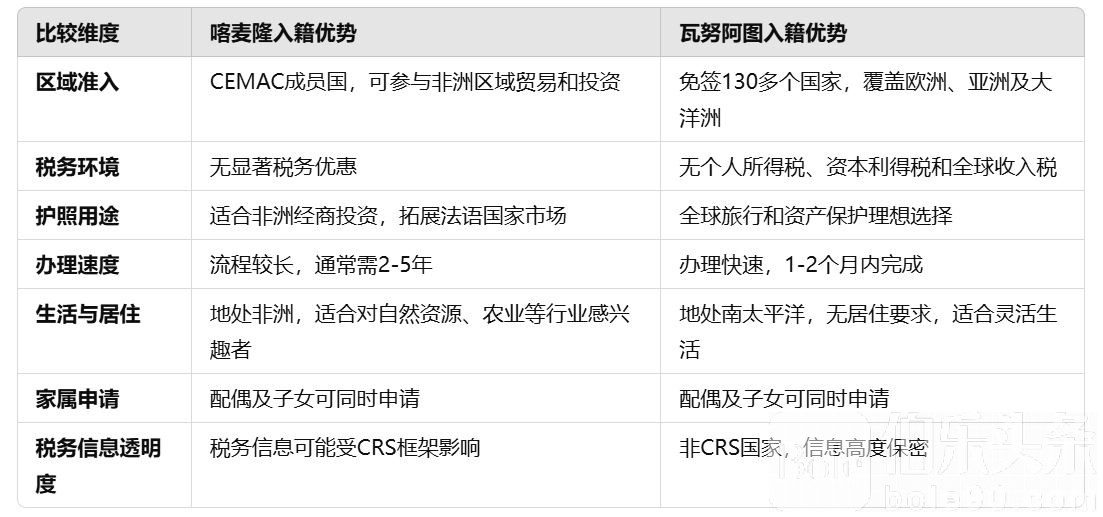 通过两者的比较我们可以看出来,喀麦隆入籍更适合计划在非洲扩展商业或长期投资资源产业的申请人。瓦努阿图入籍则因免签优势、税务优化、快速处理和灵活的居住要求,吸引了希望获得全球化生活方式的高净值人群。
