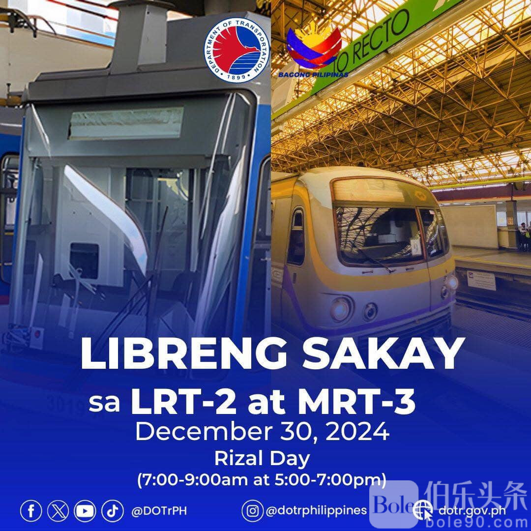 伯乐头条专讯:为纪念菲律宾民族英雄何塞·黎刹博士殉难128周年,轻轨交通2号线(LRT-2)与地铁3号线(MRT-3)将于12月30日(星期一)特别提供限时免费搭乘服务。