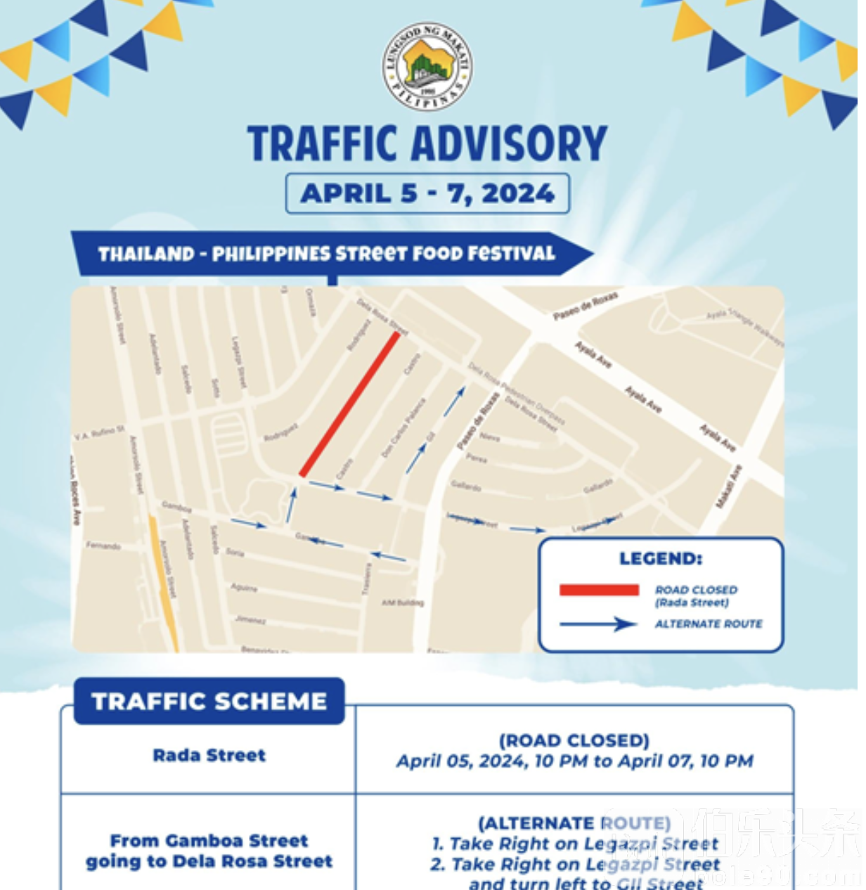 在此期间,Rada街将从4月5日晚上10点开始至4月7日晚上10点实施交通管制。对于需要从Gamboa街前往Dela Rosa街的驾车者,建议在Legazpi街右转,或从Legazpi街左转至Gil街。