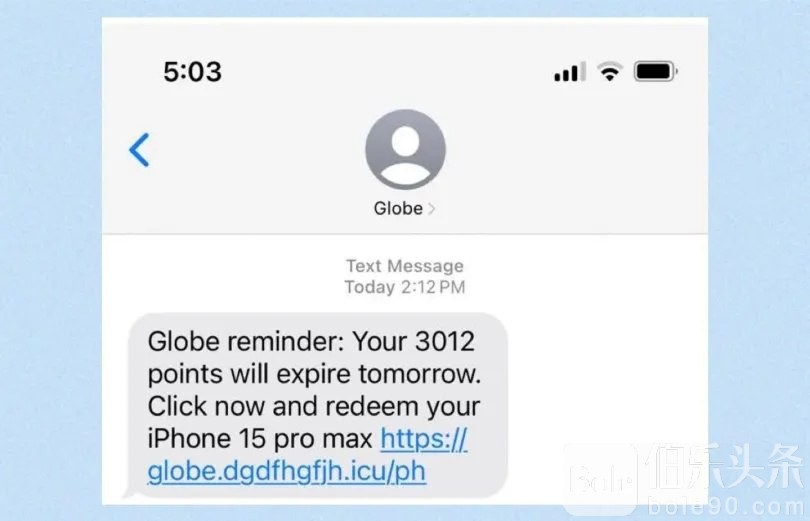 诈骗短信的完整文本如下:“Globe积分服务提醒您,您当前的3,022积分将于今天到期。尽快兑换您的积分:https://globeeph.top/i。请回复Y然后退出短信,再次打开短信激活链接,或将链接复制到Safari浏览器并打开。”