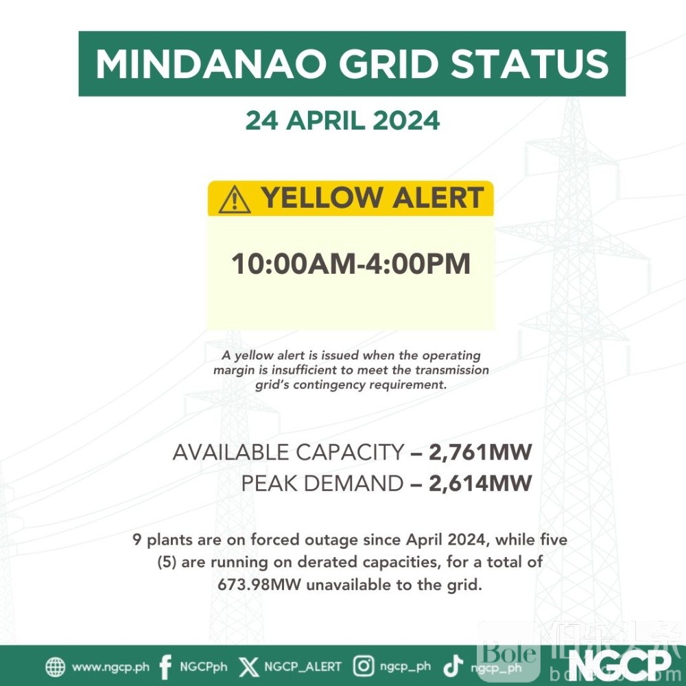 棉兰佬岛电网的情况也面临类似困境,可用容量为2761兆瓦,而峰值需求为2614兆瓦。9座发电厂被迫停电,另外5座发电厂正在降额运行,导致总计673兆瓦的电力无法并网。黄色预警时段为早上10点至下午4点。