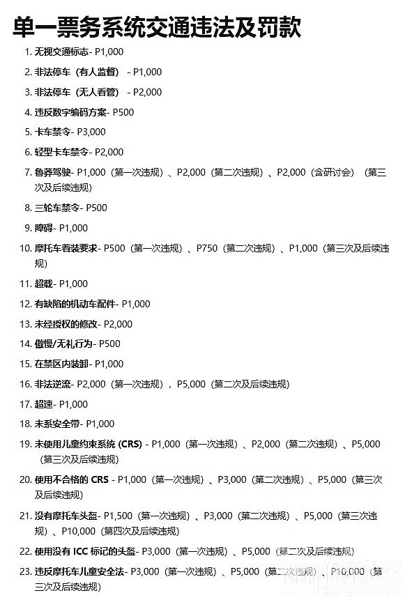 然而,MMDA 的罚款金额经常会在网上引起争议,可以参考文章中贴出交通违法罚款价目表。