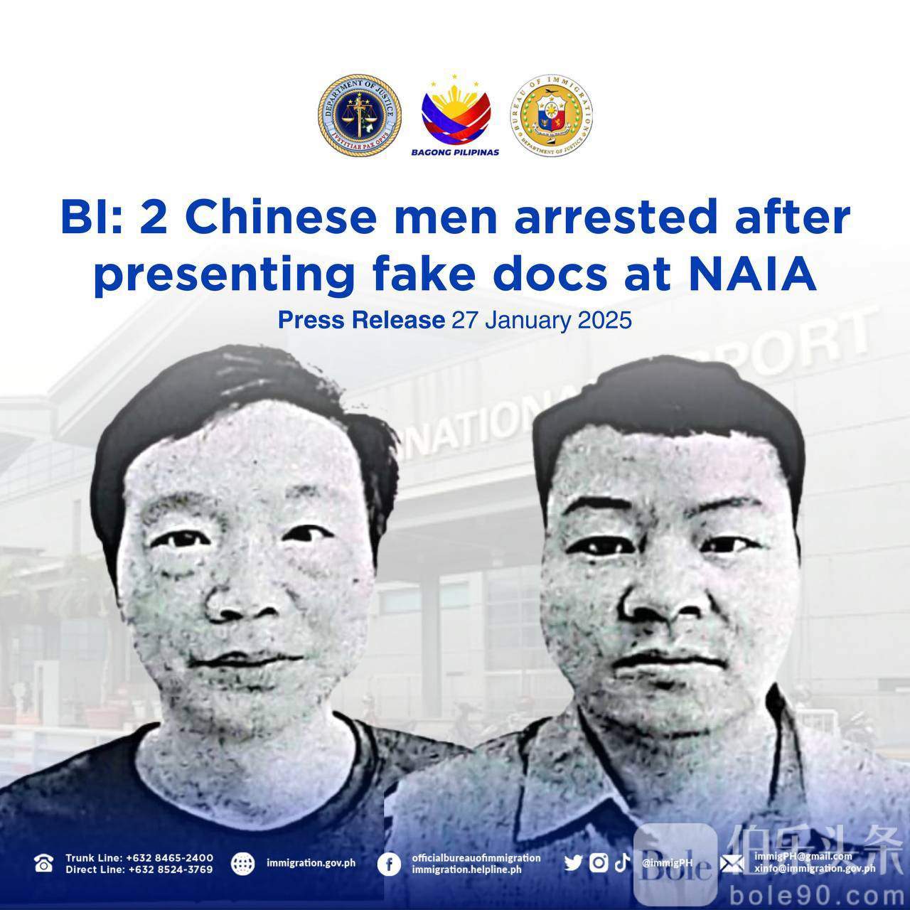 伯乐头条专讯:移民局 (BI) 于 1 月 24 日在尼诺伊·阿基诺国际机场 (NAIA) 3 号航站楼逮捕了两名出示伪造出境许可的中国男子。