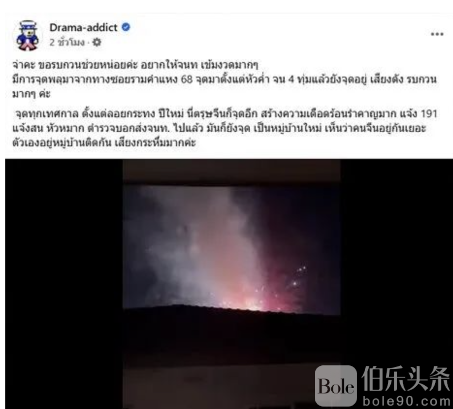 此外,兰甘杏(Ramkhamhaeng)68巷的居民也反映,从傍晚至晚上10点,烟花的噪声持续不断,严重影响了周围居民的生活。尽管多次向警方报告,但问题依旧没有得到有效解决。
