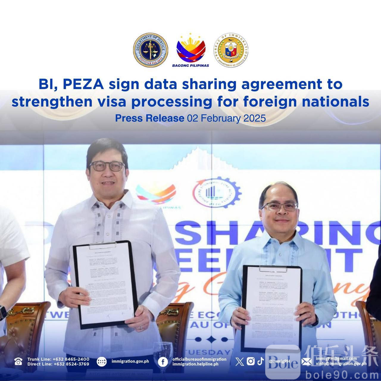伯乐头条专讯:菲律宾移民局 (BI) 和菲律宾经济特区管理局 (PEZA) 已正式签署数据共享协议 (DSA),为在 PEZA 注册的生态区工作的外国人签发和实施 PEZA 签证时的数据共享和处理制定明确的指导方针。