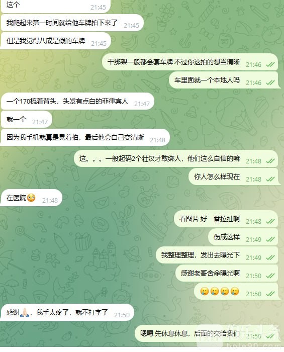 “刚才九点左右在shore那附近的红绿灯差点被绑架,这个车下来一个小菲二话不说就把我往车上拉,幸好就一个小菲,加上我比较壮实,让我给跑了。我爬起来第一时间就给他车牌拍下来了。但是我觉得八成是假的车牌。绑匪就一个人,一个170梳着背头,头发有点白的菲律宾人。“