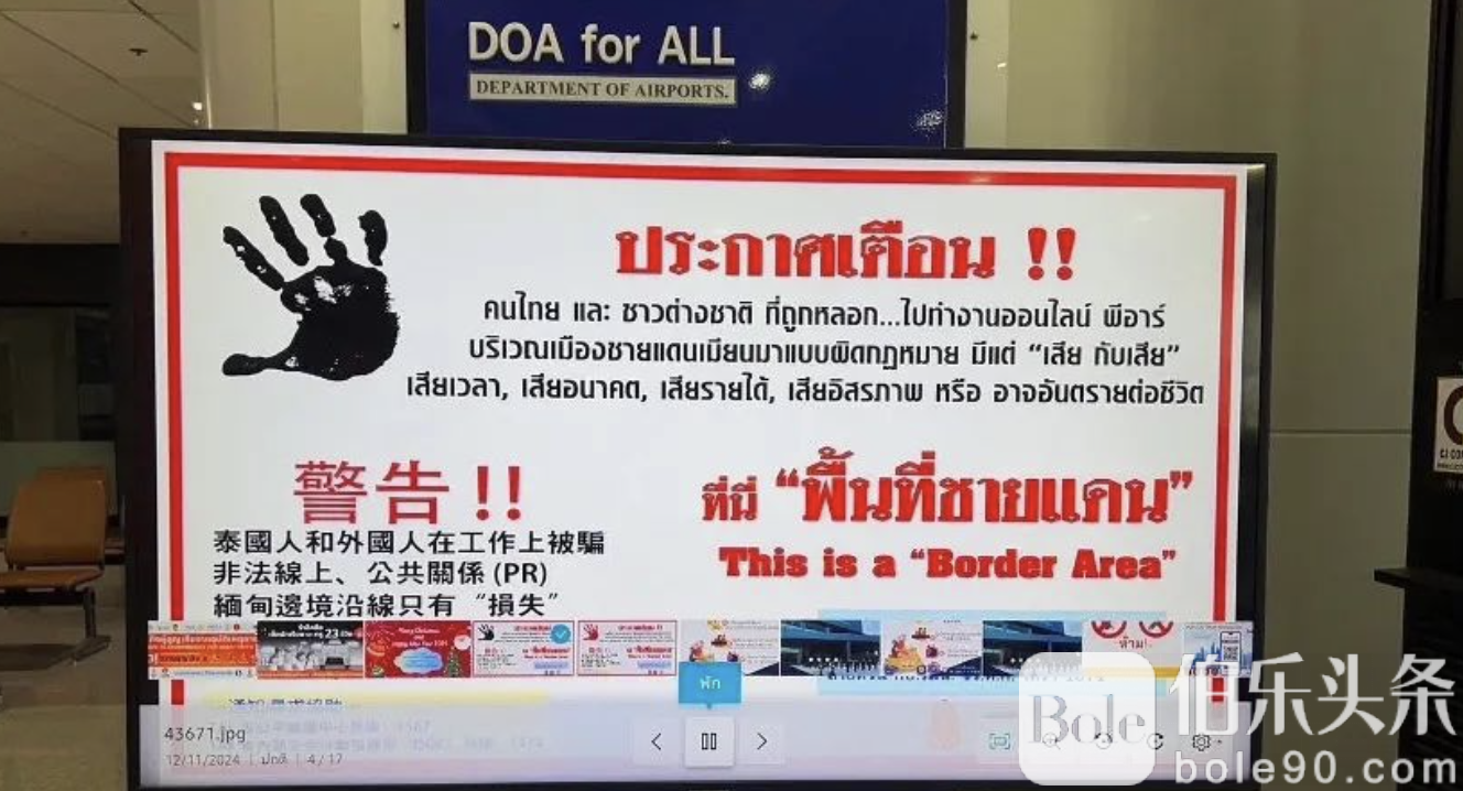 1月10日左右,泰国达府移民局近日在泰缅边境主要通道及边境检查站设置中文、泰文和英文三种语言的警示牌 ,提醒外国人尤其是来自高风险国家的移民工人小心被骗至缅甸,成为诈骗、人口贩卖或器官贩卖的受害者,并在美索县Ban Huai Hin Fon检查站设立了警示点,提示进入该地区的外国人注意避免通过非法通道进入缅甸。