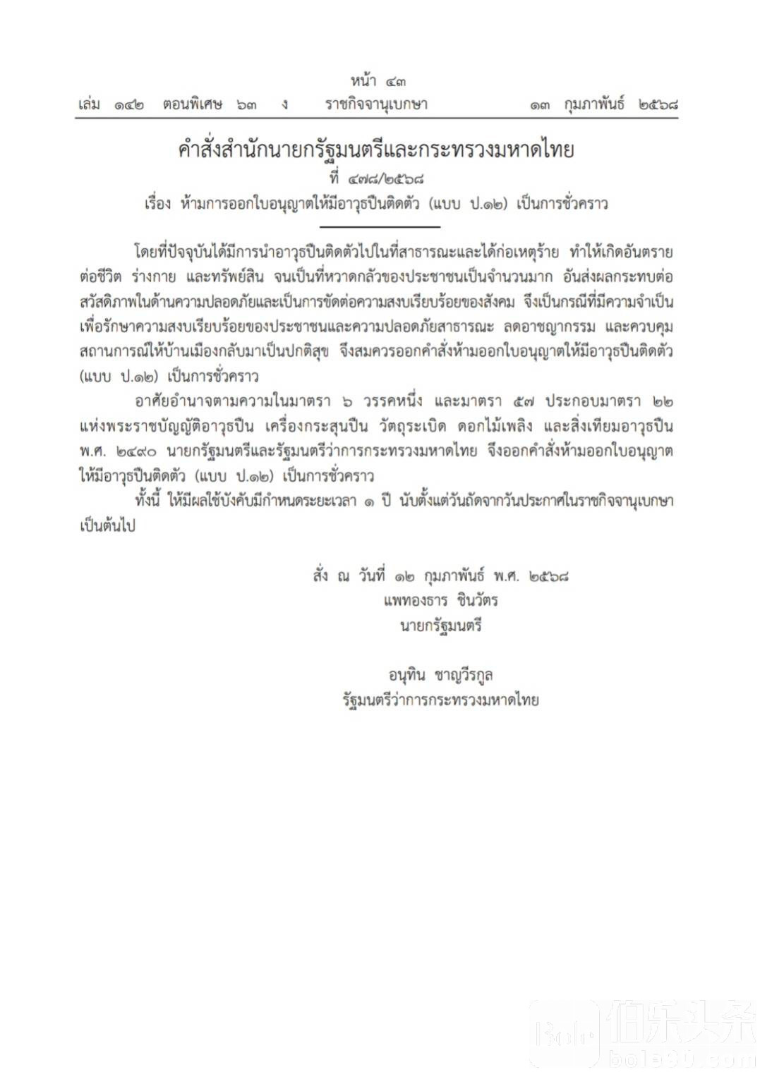 岱素丽表示,根据《枪支法》,佩通坦总理和内政部长阿努霆作为主管领导,已签署完成该命令,并将于今天在政府公报网上发布。此禁令从2月14日起正式生效,为期一年。