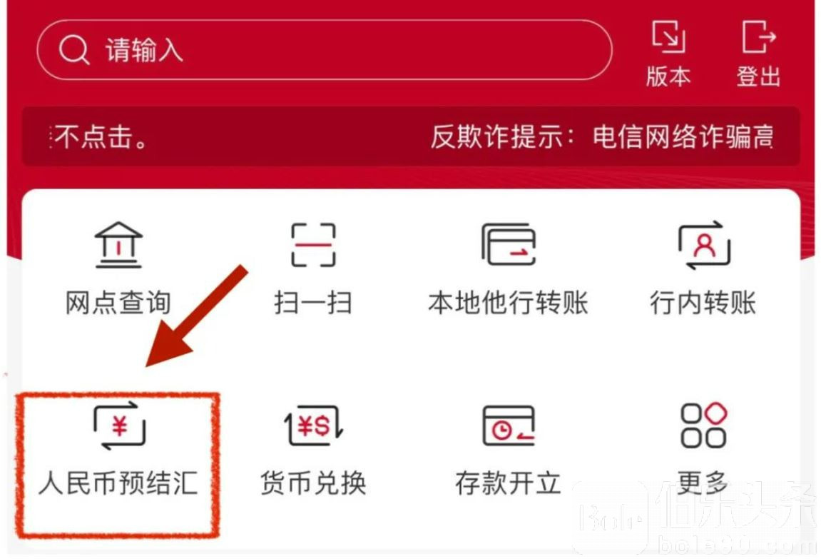 1.登陆中国银行(BOC)手机银行,首次使用的用户,在首页搜索“人民币预结汇”。选择转出的(美元)账户,以及转入的(人民币)账户。