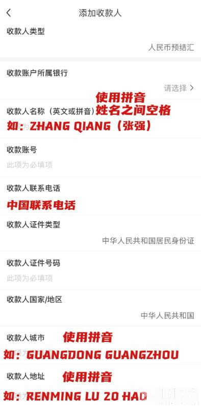 收款人姓名拼音名与姓之间需空格,所在城市及收款人地址也需输入拼音。