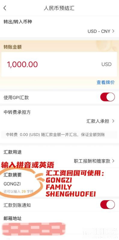 4.输入汇款金额后,用途一般选择“职工报酬和赡家费”,必填项汇款摘要需以拼音或大写英语填写,可输入:“GONGZI”,“FANILY”,“SHENGHUOFEI”