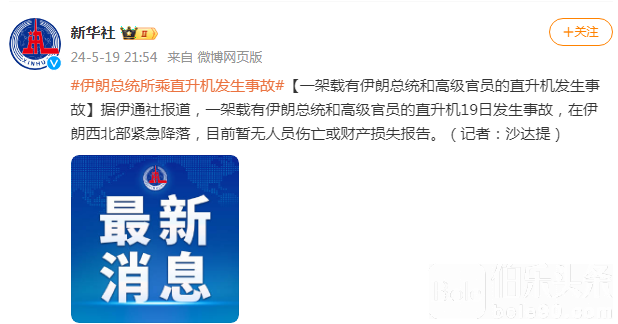 伯乐头条专讯:据新华社消息,伊通社报道,一架载有伊朗总统和高级官员的直升机19日发生事故,在伊朗西北部紧急降落,目前暂无人员伤亡或财产损失报告。据@CCTV国际时讯 最新消息,伊朗国家电视台报道,初步报告显示,伊朗总统莱希乘坐的一架直升机今天(5月19日)在该国东阿塞拜疆省“出现硬着陆事故”。报道称,事发地点在东阿塞拜疆省瓦尔扎甘地区附近,由于大雾等恶劣天气影响,救援团队正在努力抵达事故现场。