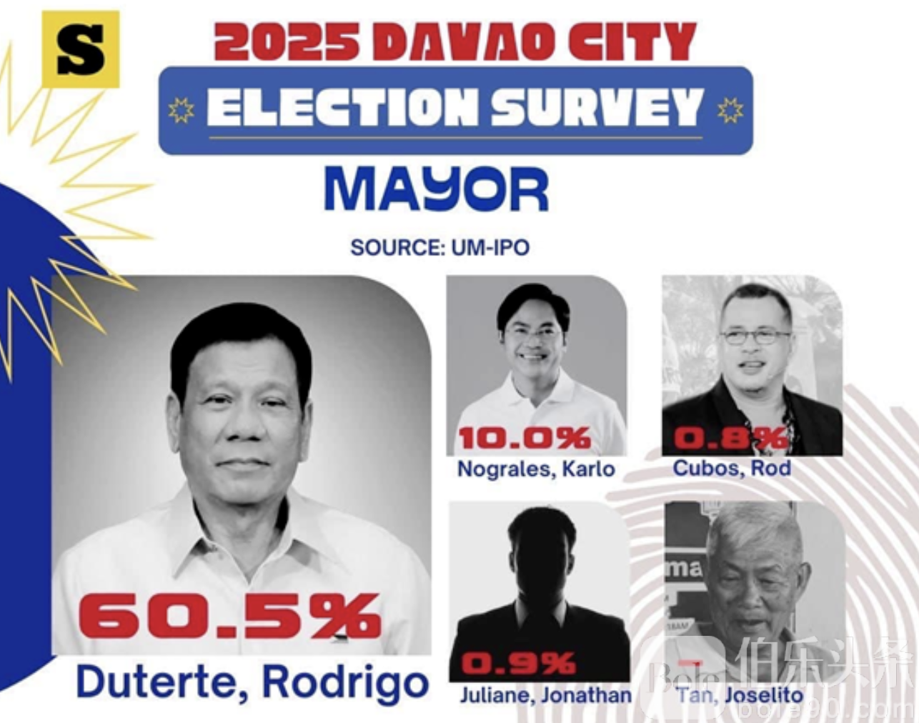 伯乐头条专讯:随着2025年菲律宾中期选举临近,前总统罗德里戈·杜特尔特被广泛视为达沃市长职位的最热门人选。最新民调显示,他的支持率高达60%,远超其他竞争对手。