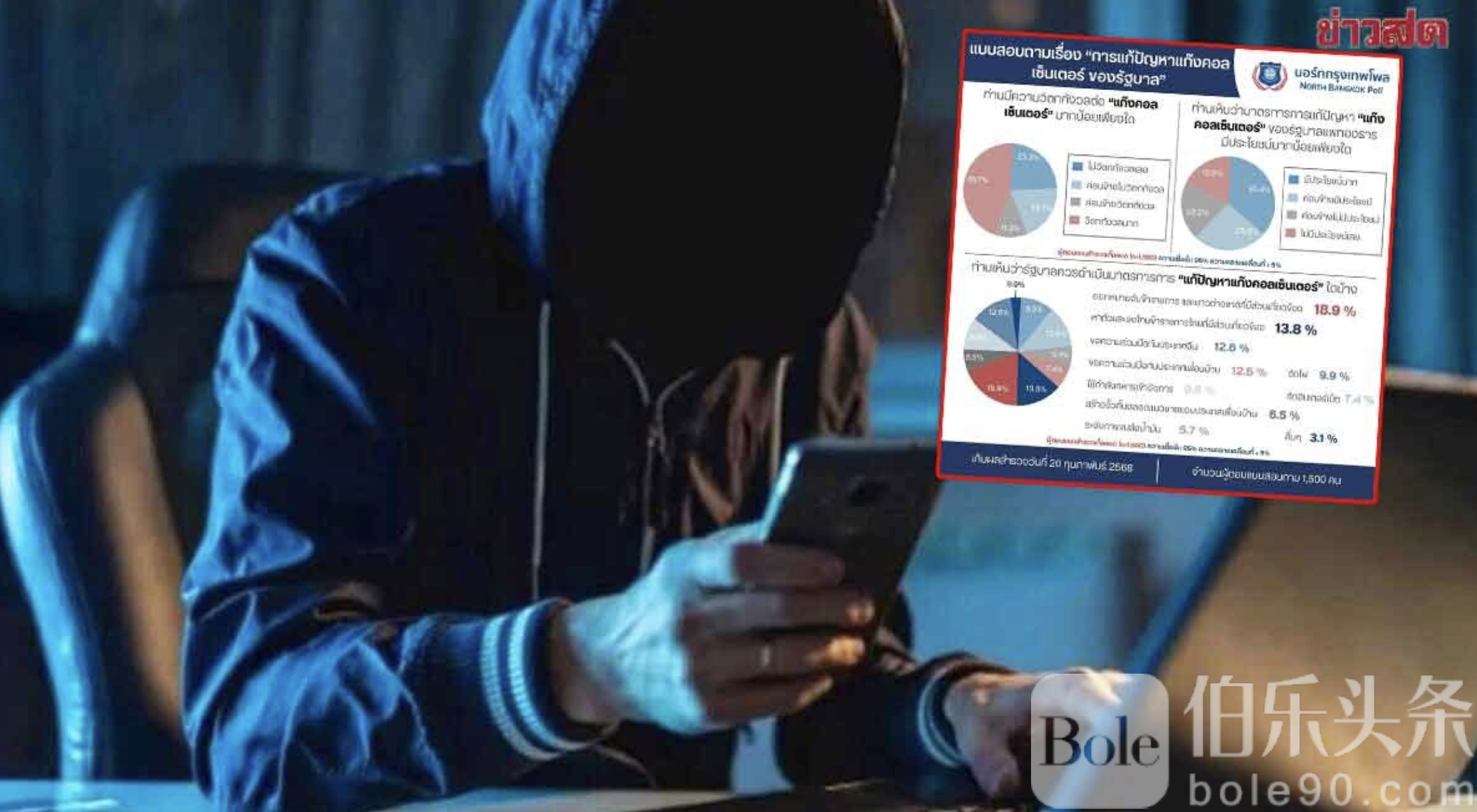 伯乐头条专讯:2月22日,泰国曼谷北部大学北曼谷民调中心公布了于2月20日开展的主题为“政府解决电信诈骗问题”的民意调查结果,调查对象为全泰各地区的1,500人。调查显示,当问及民众对“电信诈骗”的担忧程度时,有57%的人表示担忧,其中,45.7%的人表示很担忧,11.3%的人表示非常担忧,19.7%的人表示不太担忧,以及23.3%表示不担忧。