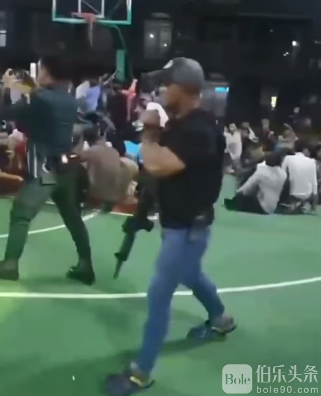 镜头再次转换后,能明显看到一个篮球场上蹲满了人,人群后方还有持枪的宪兵在巡逻和拍照。