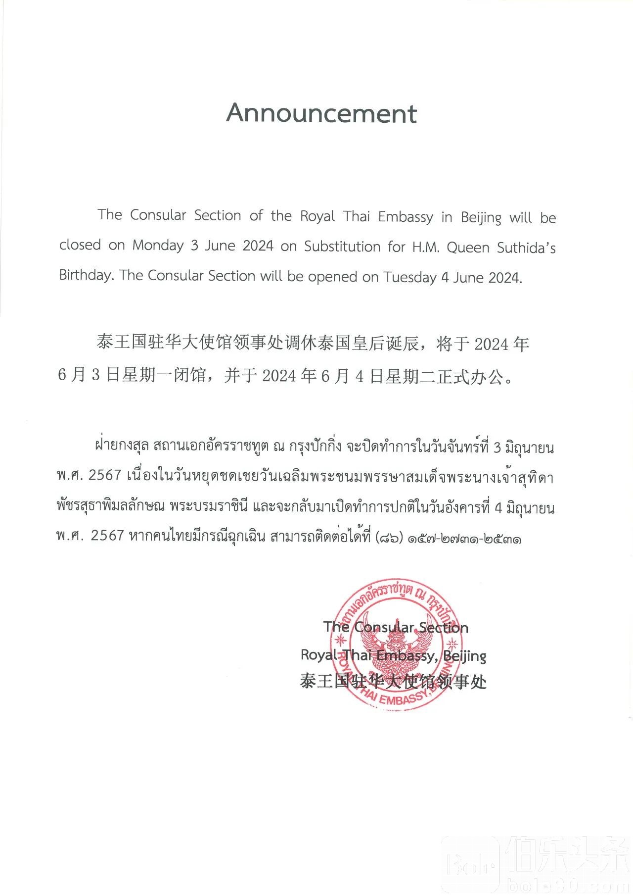 伯乐头条专讯:驻泰国大使馆发布放假通知,将于6月3号周一闭馆,到6月4号周二正式开始办公!