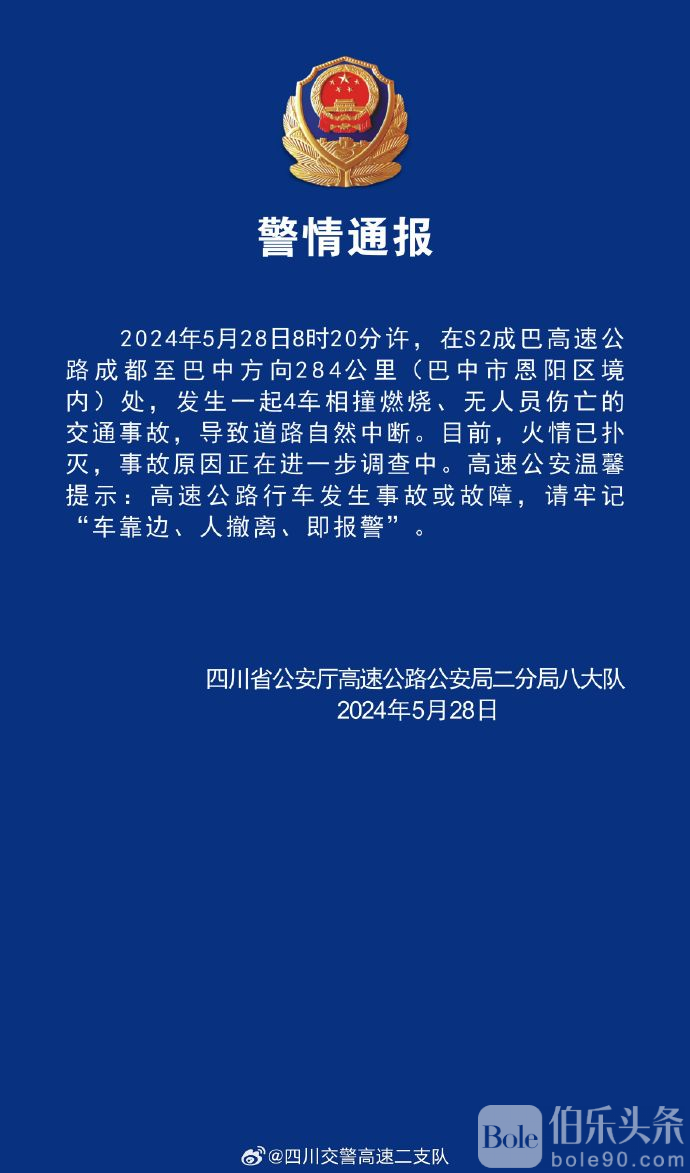 2024年5月28日8时20分许,在S2成巴高速公路成都至巴中方向284公里(巴中市恩阳区境内)处,发生一起4车相撞燃烧、无人员伤亡的交通事故,导致道路自然中断。目前,火情已扑灭,事故原因正在进一步调查中。高速公安温馨提示:高速公路行车发生事故或故障,请牢记“车靠边、人撤离、即报警”
