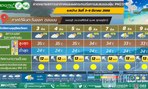 气象局的天气预报提醒中提到,3月4-5日期间,泰国北部地区最低温16-25度、最高温34-41度,3月6-9日期间北部10-20%的地区有雷雨及强风,最低温18-23度、最高温30-37度。