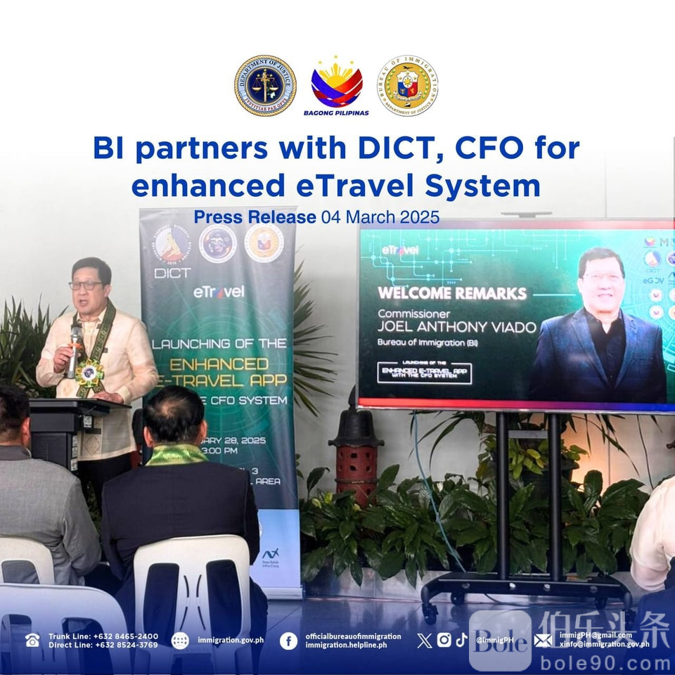 伯乐头条专讯:菲律宾移民局(BI)携手信息和通信技术部(DICT)及海外菲律宾人委员会(CFO),正式推出升级版电子旅行系统(eTravel System),标志着菲律宾在旅客通关现代化和边境安全方面迈出了重要一步。