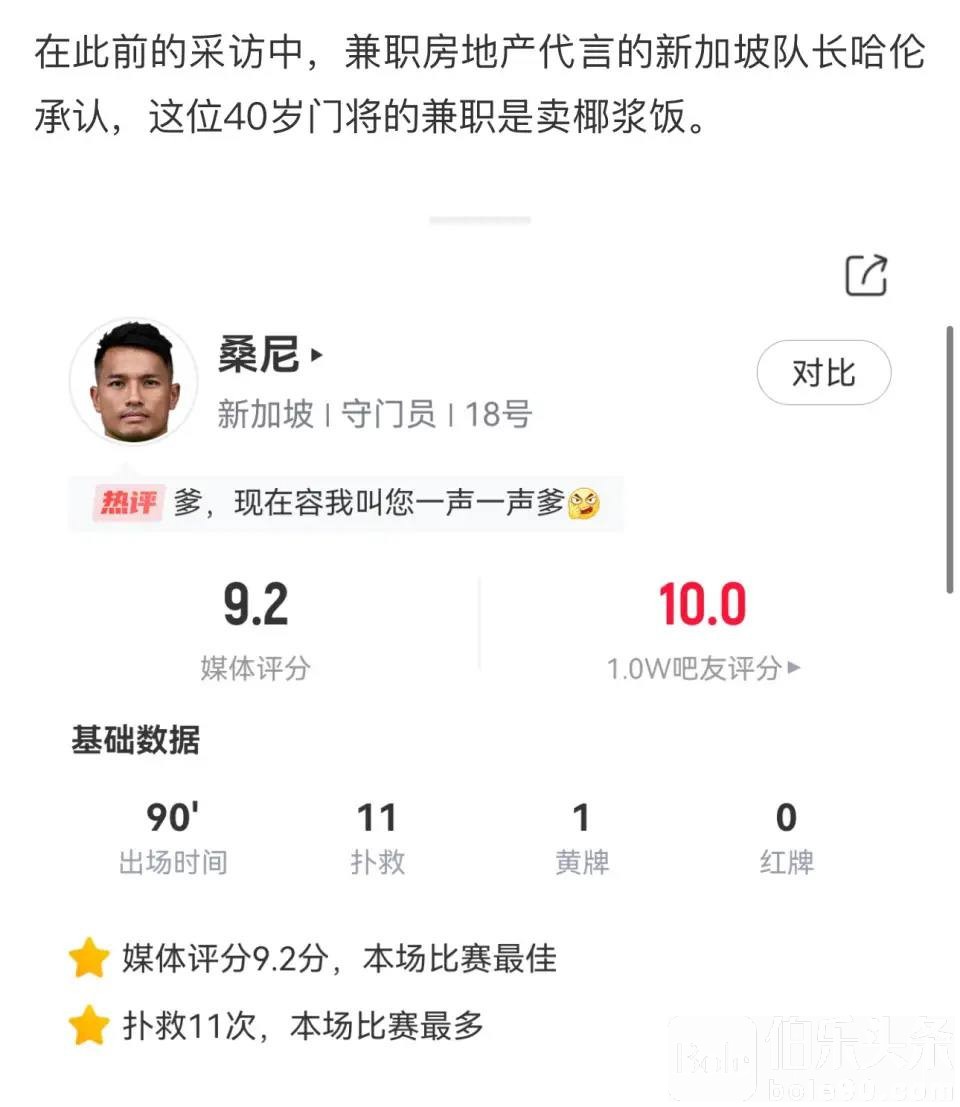 桑尼,全场比赛贡献了11次精彩的扑救,可以说但凡桑尼少扑一球,那么中国男足就已经被淘汰出局。可以说新加坡队门将桑尼,是中国队晋级的最大功臣。