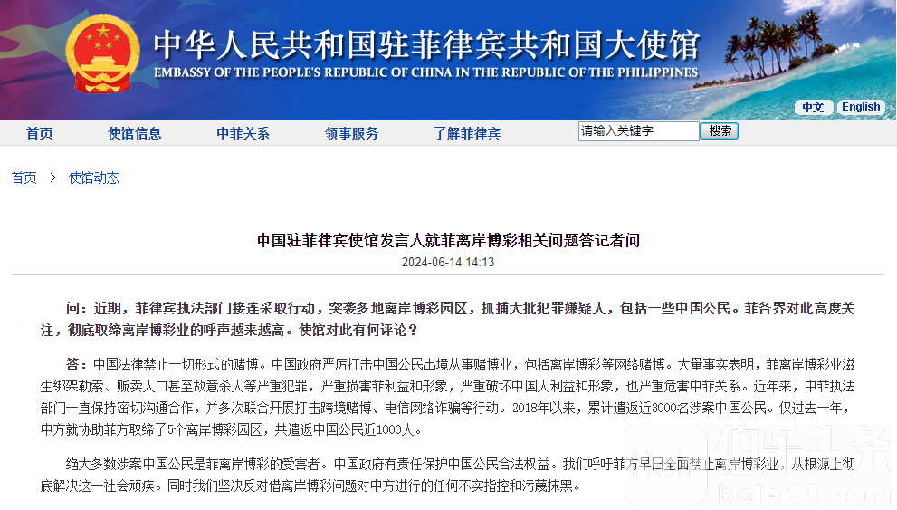 伯乐头条专讯:中国驻马尼拉大使馆周五表示,菲律宾离岸博彩运营商(POGO)应该被取缔,因为它们已经成为各种犯罪的避风港。