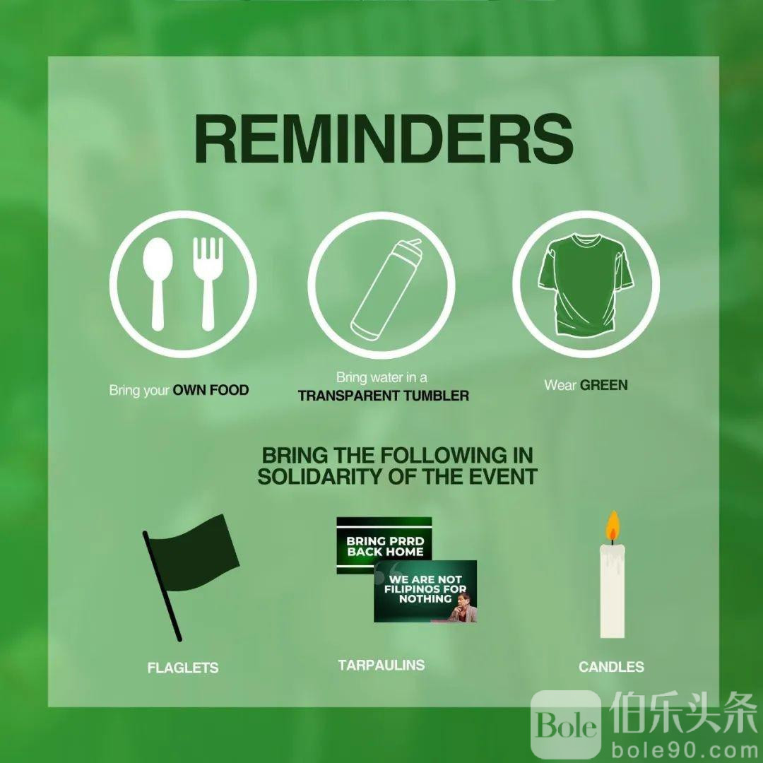 组织方还鼓励 穿绿色服装 以象征团结,并对愿意 捐赠食物和水 的支持者提供联系人 Dolly(0932-768-7363) 进行协调。