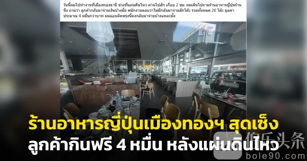 据泰国某脸书账户的帖子透露,地震当天,一家日本餐厅的顾客纷纷因地震的发生匆忙逃离,直到地震平息后,餐厅发现有26桌客人并未返回付账。两小时后,餐厅工作人员依然未见任何顾客回来结账,预计餐厅损失约为4万泰铢。目前尚不清楚是否会有顾客在之后补上餐费。