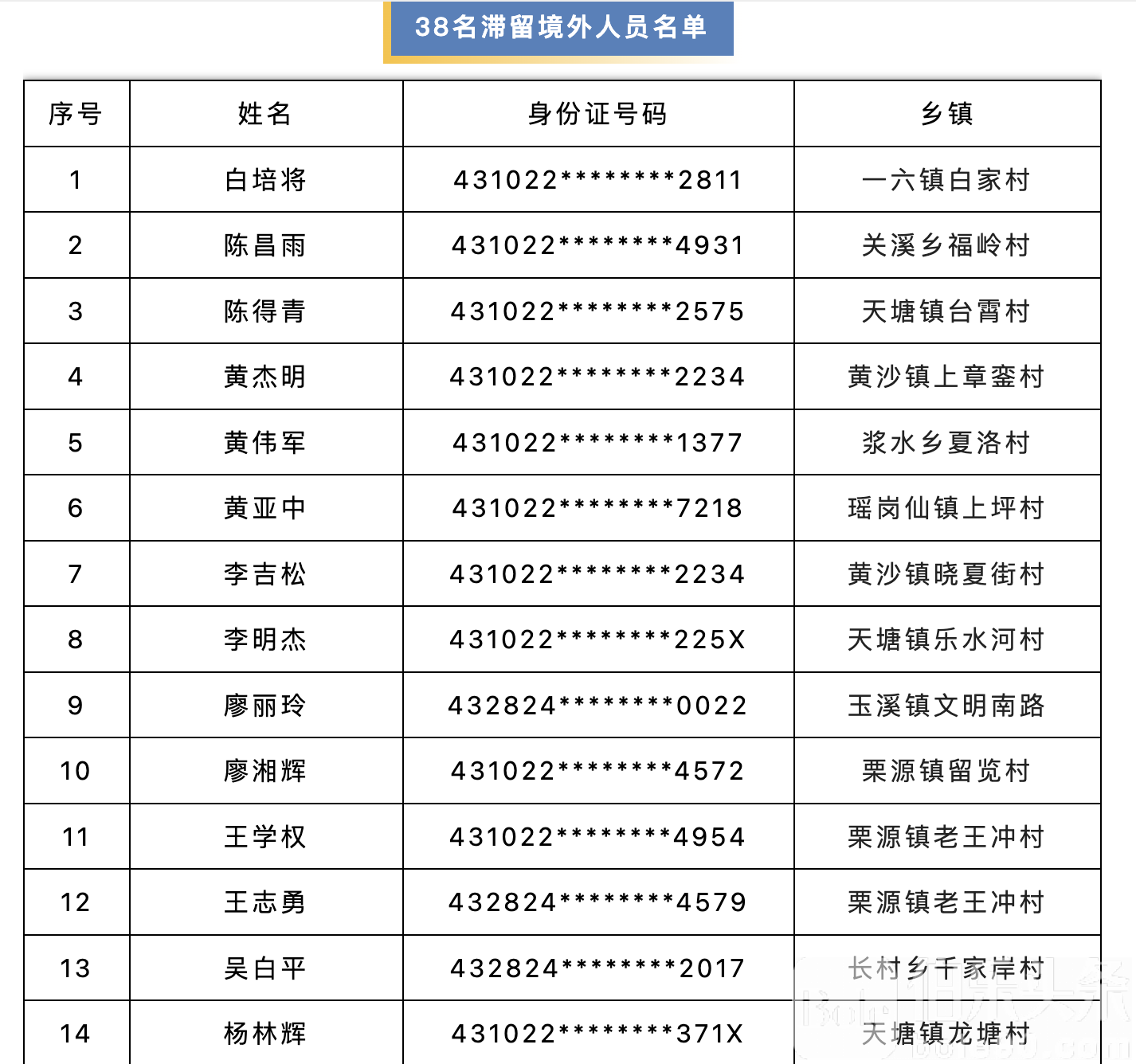 根据我国相关法律规定,宜章县公安局对宜章籍滞留境外人员开展多次劝返工作,大多数人能迷途知返,积极主动回国,但目前仍有少数人员滞留境外未回国。现宜章县公安局对非法滞留缅北、阿联酋、柬埔寨、菲律宾等国家的38名宜章籍人员再次依法公开劝返,特通告如下: