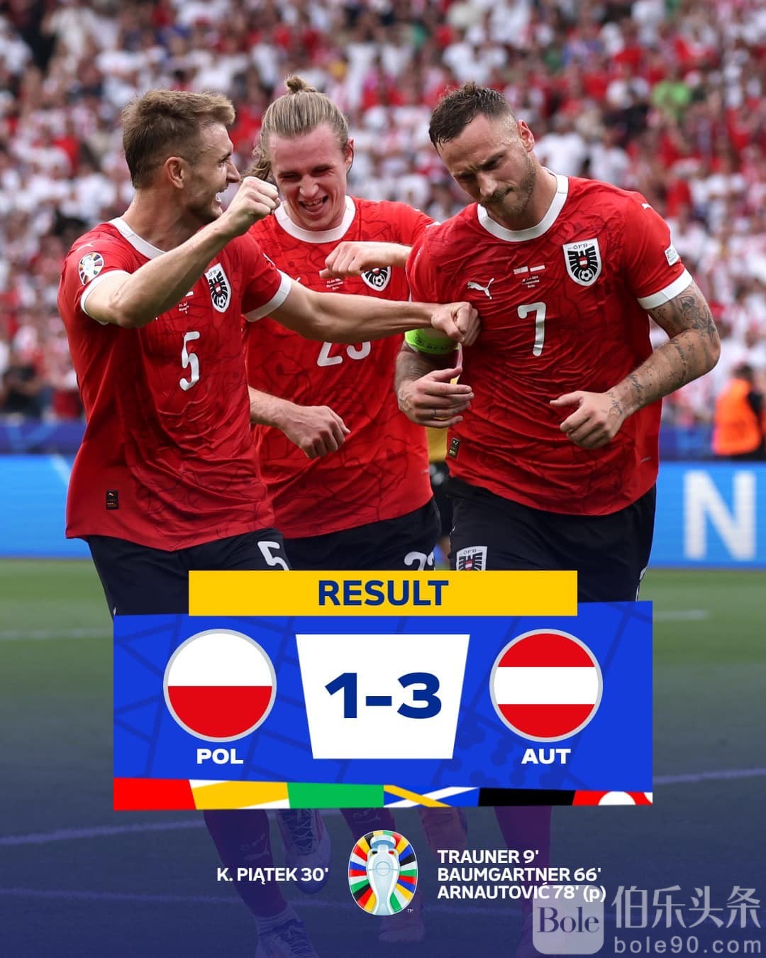 比赛的关键时刻出现在第78分钟,阿瑙托维奇成功罚入点球,确保奥地利锁定胜局。尽管波兰在接下来的比赛中努力创造机会,但未能改变比赛的局面,最终以1-3告负。