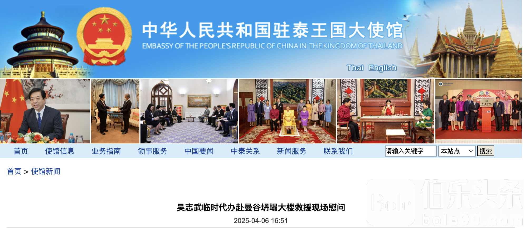 伯乐头条专讯:46日,吴志武临时代办偕泰国中国企业总商会代表赴曼谷坍塌大楼救援现场,与曼谷市长查察共同查看现场救援工作,看望工作人员和志愿者。