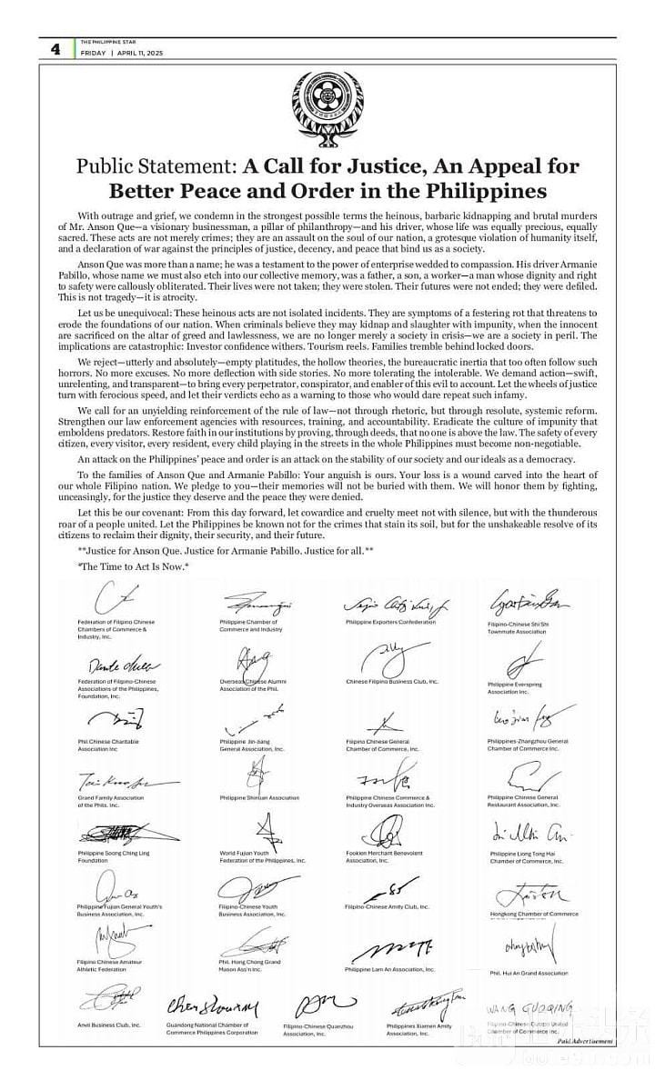 伯乐头条专讯:由菲律宾华商联总会(FFCCCII)发起,来自全国各地的33家华人商会近日联合发表声明,强烈谴责近期震惊社会的绑架与谋杀案件,呼吁政府严惩凶手并推动更有力的法治改革。