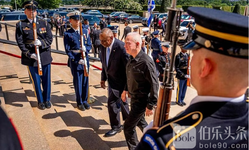 以色列防长加兰特(右)星期二(6月25日)访美,并到五角大楼会见美国国防部长奥斯汀。分析指他此行的主要目的是说服美国把早前扣住的一批重型炸弹交付给以色列。(法新社)