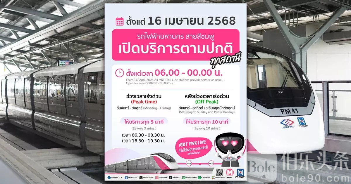 另外,截至2025年3月底,粉线地铁延长段(从Si Rat站至IMPACT会展中心站)项目总体进度已达93.82%。特许经营商曼谷北部单轨铁路有限公司(NBM)正在进行列车测试,为开通做准备,预计2025年6月可开放公众试乘,并于2025年7月正式投入运营。