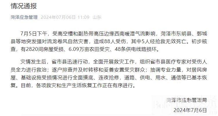 伯乐头条专讯:山东省菏泽市应急管理局7月6日发布情况通报,7月5日下午,受高空槽和副热带高压边缘西南暖湿气流影响,菏泽市东明县、鄄城县等地突发强对流龙卷风自然灾害,造成88人受伤,其中5人经抢救无效死亡。初步核查,有2820间房屋受损、6.09万亩农田受灾、48条供电线路损坏。