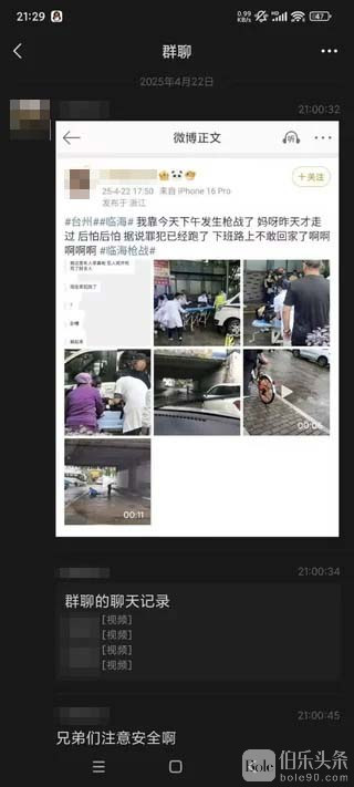 伯乐头条专讯:4月22日下午,网传浙江省台州市临海市泉井洋路附近疑似发生严重枪击事件,多段现场视频在社交媒体上流传,引发广泛关注。画面中可见至少两名身穿警服人员倒地,地面血迹斑斑,另有市民声称出租车司机遭枪击身亡,事件具体细节仍有待官方确认。