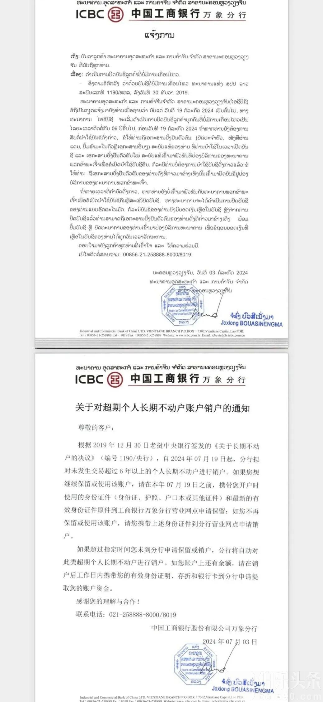 伯乐头条专讯:根据 2019年12月30日老挝中央银行签发的《关于长期不动户的决议》 (编 号 1 1 9 0 / 央 行 ) , 自2024年7月19日起,分行拟对未发生交易超过6 年以上的个人长期不动户进行销户。