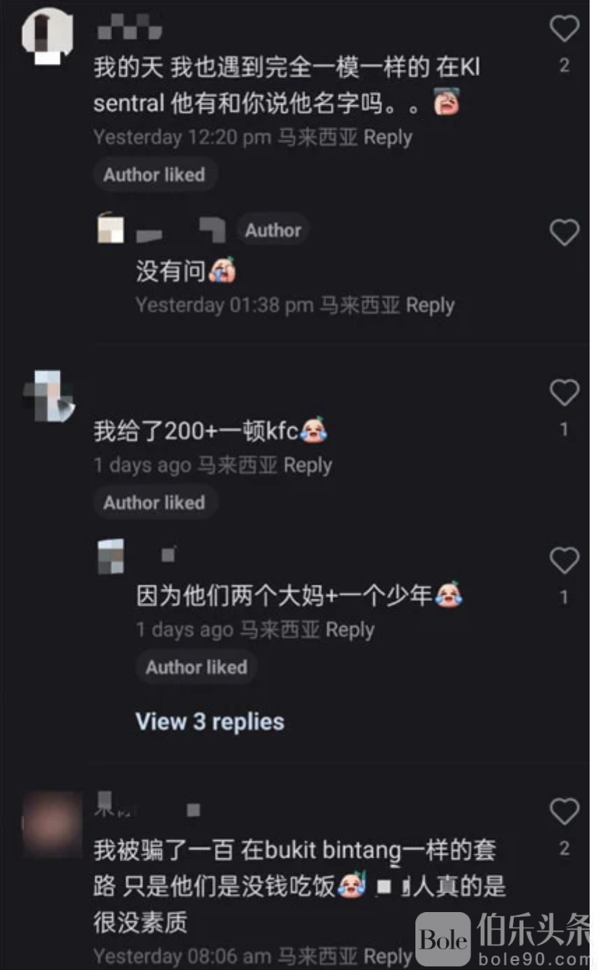 网友们纷纷表示震惊和愤怒,因为他们中很多人都有类似的经历。这些诈骗事件发生在吉隆坡的各大购物广场和公共交通站。一些网友称被骗金额高达100令吉,甚至有一名华裔男子借出200令吉,并请了两位中国“大妈”和一名少年吃肯德基,事后他哭笑不得。