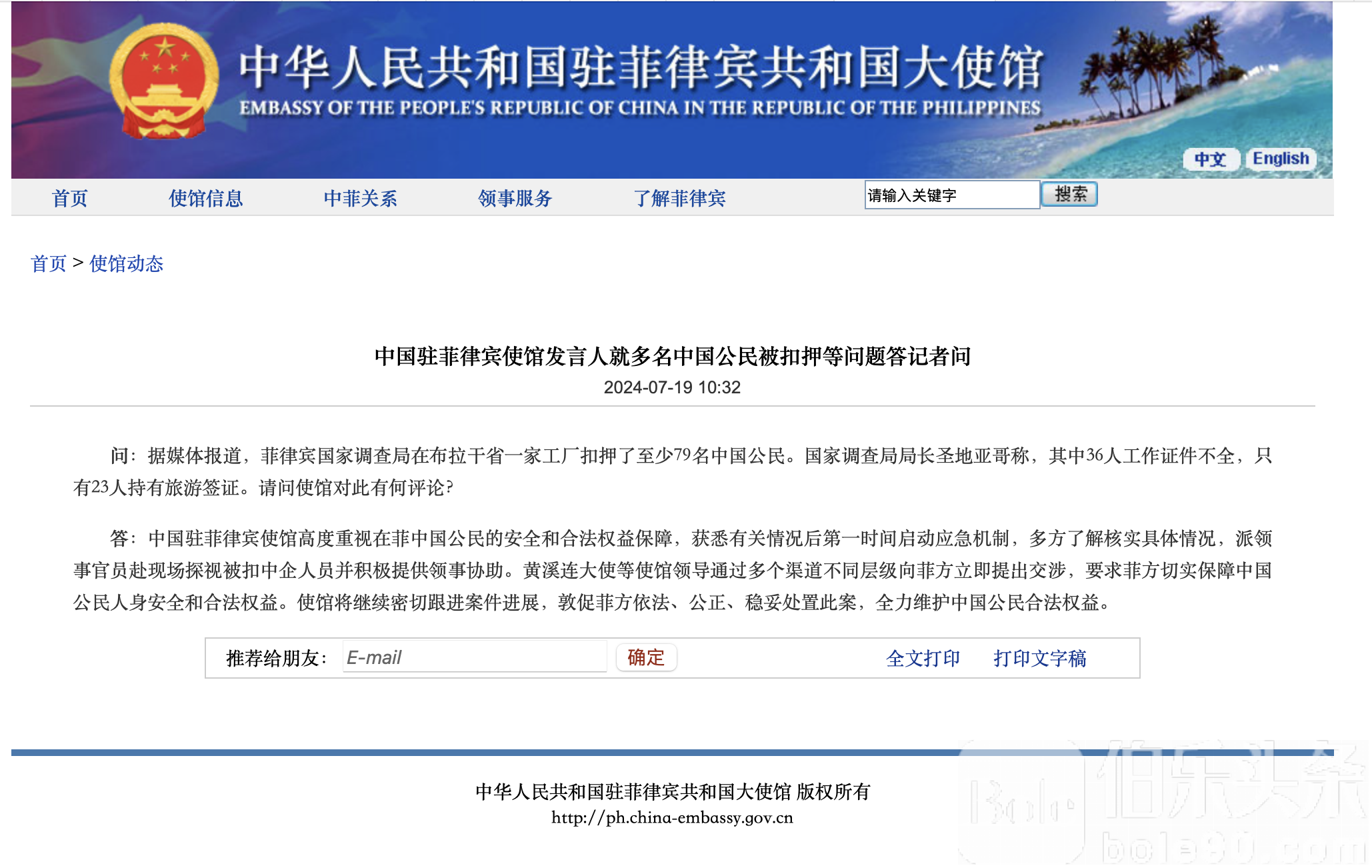 伯乐头条专讯:据媒体报道,菲律宾国家调查局在布拉干省一家工厂扣押了至少79名中国公民。国家调查局局长圣地亚哥称,其中36人工作证件不全,只有23人持有旅游签证。请问使馆对此有何评论?