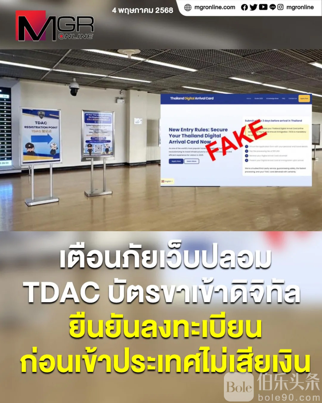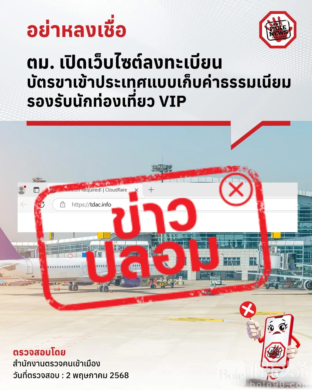 对此,泰国政府假新闻打击中心已就“移民局收取电子入境卡手续费”及“接待VIP旅客”等传闻进行核查,并明确指出上述信息均为虚假内容,与移民局无任何关联,呼吁公众切勿轻信不明来源网站。