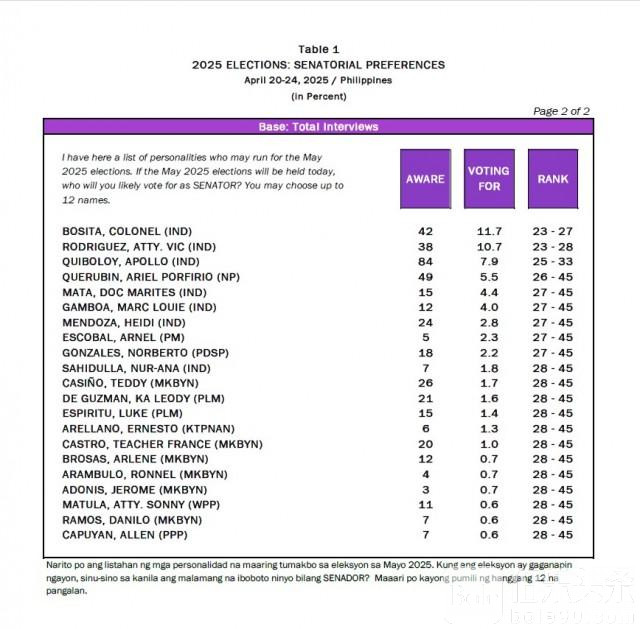 此外,前内政部长本胡尔·阿巴洛斯(Benhur Abalos Jr.)、前参议员曼尼·帕奎奥(Manny Pacquiao)、巴姆·阿基诺(Bam Aquino)、基科·潘吉利南(Kiko Pangilinan)等人也出现在前20名之列,得票率介于26%至34%之间。