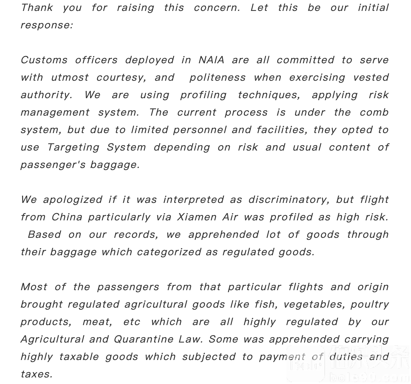 有网友透露,他因不满入境时的遭遇,向菲律宾海关局(BOC)提交正式投诉,并已收到官方回应。对此,菲律宾海关作出澄清与解释。