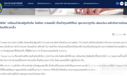 同日,泰国商业部官网发稿,称泰国商业部长披猜与太原老葛会面,表示商业部计划支持太原老葛直播带货榴莲。