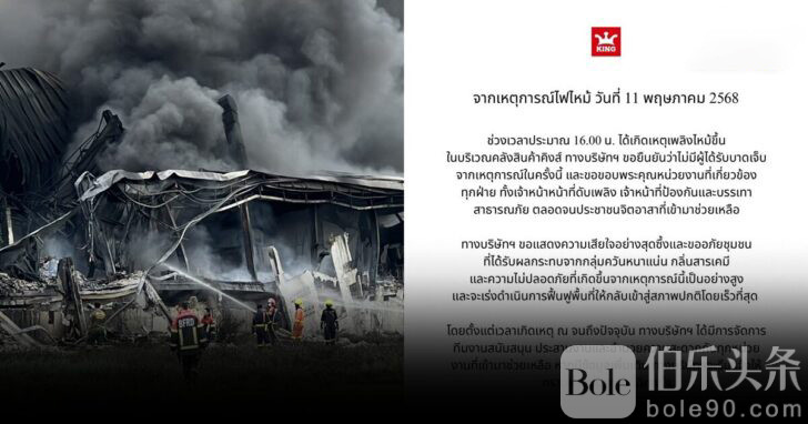 涉事仓库所属公司King Kitchen Thailand于今日(5月12日)通过官方社交媒体发布声明,对火灾事件表示遗憾,并向受浓烟、化学气味及安全威胁影响的周边居民致歉。公司确认火灾未造成人员伤亡,感谢消防、救援部门及志愿者的大力支持。