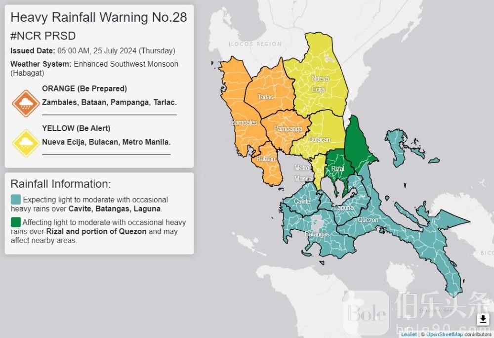 首都地区、布拉干省(Bulacan)和新怡诗夏省(Nueva Ecija)则被置于黄色大雨警告下,表明这些高风险区域有可能发生淹水或洪水。
