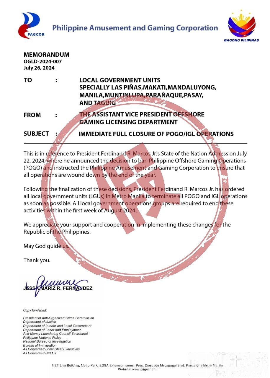 伯乐头条专讯:网络上开始流传PAGCOR给地方政府发了通知:要求2024年8月第一周,暂停所有POGO和IGL相关业务。