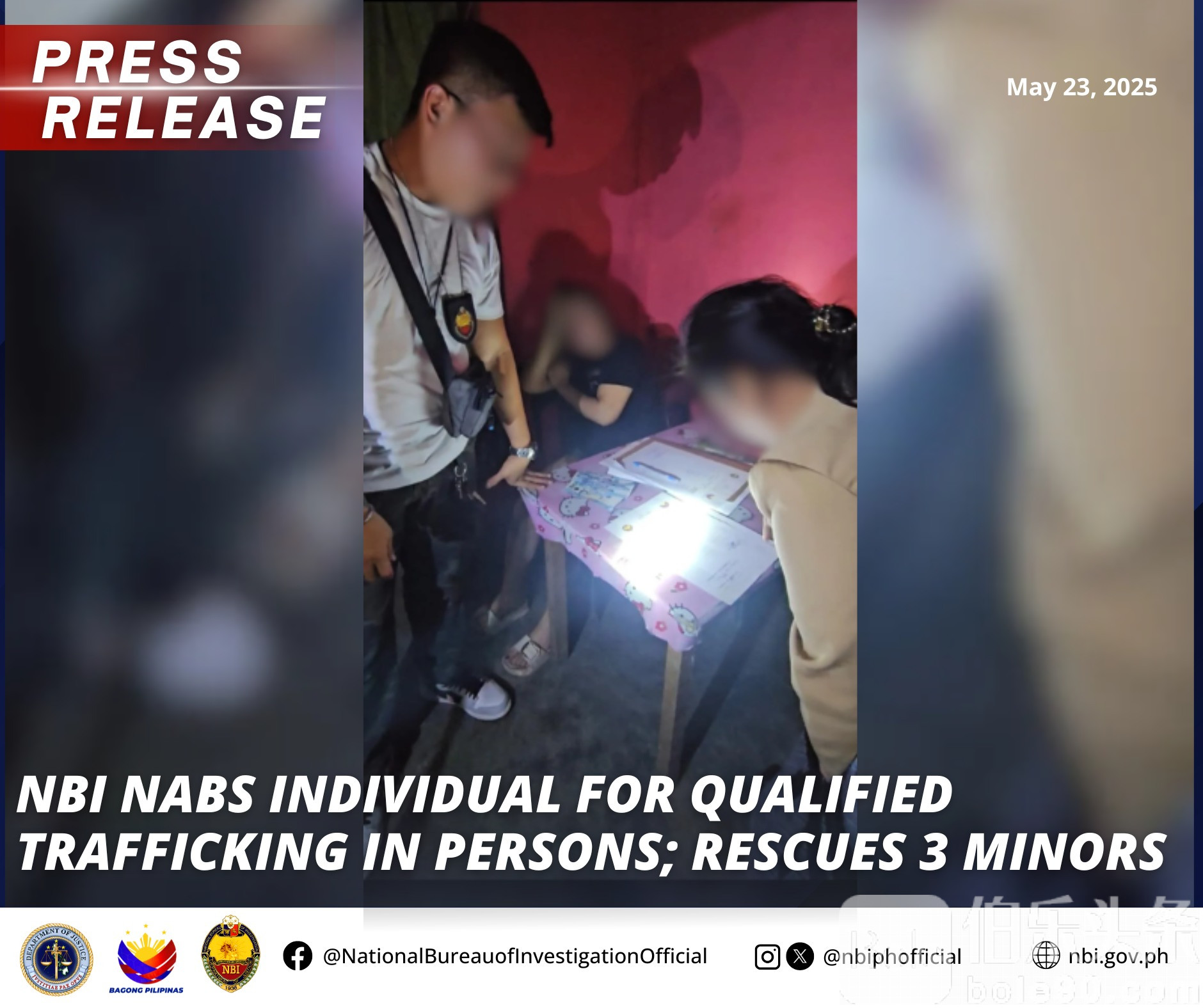 伯乐头条专讯:为强化对未成年人贩运犯罪的打击力度,菲律宾国家调查局(NBI)依照退休法官兼现任局长海梅·B·圣地亚哥的指示,近日于三描礼士省圣安东尼奥市展开联合执法行动,成功拘捕一名涉嫌从事人口贩运活动的女子,现场共救出八名受害者,其中包括三名未成年女性。