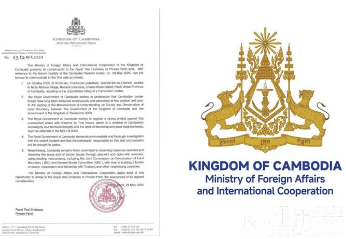 伯乐头条专讯:柬埔寨外交与国际合作部于5月28日晚向泰国当局正式提出严正抗议,强烈谴责当日清晨发生在柏威夏省边境地区的枪击事件,并要求泰方尽速查明真相、严惩凶手。